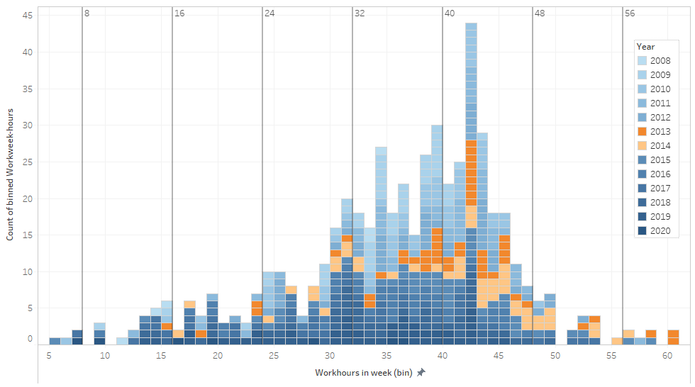I measured the sum of tracked hours for each week, then binned them to count up how many of each there are. So that high bar, that mode of "workhours in a week" is 42: the count of weeks in which I worked an estimated total between 42.0 and 43.0 hours. Turns out I did that 44 times/weeks in a little over a decade.